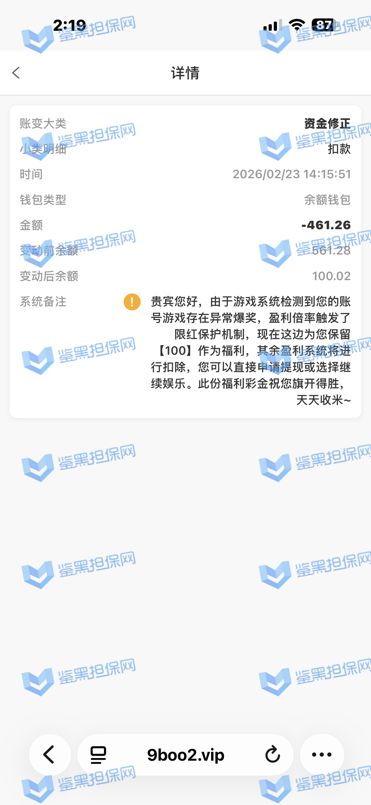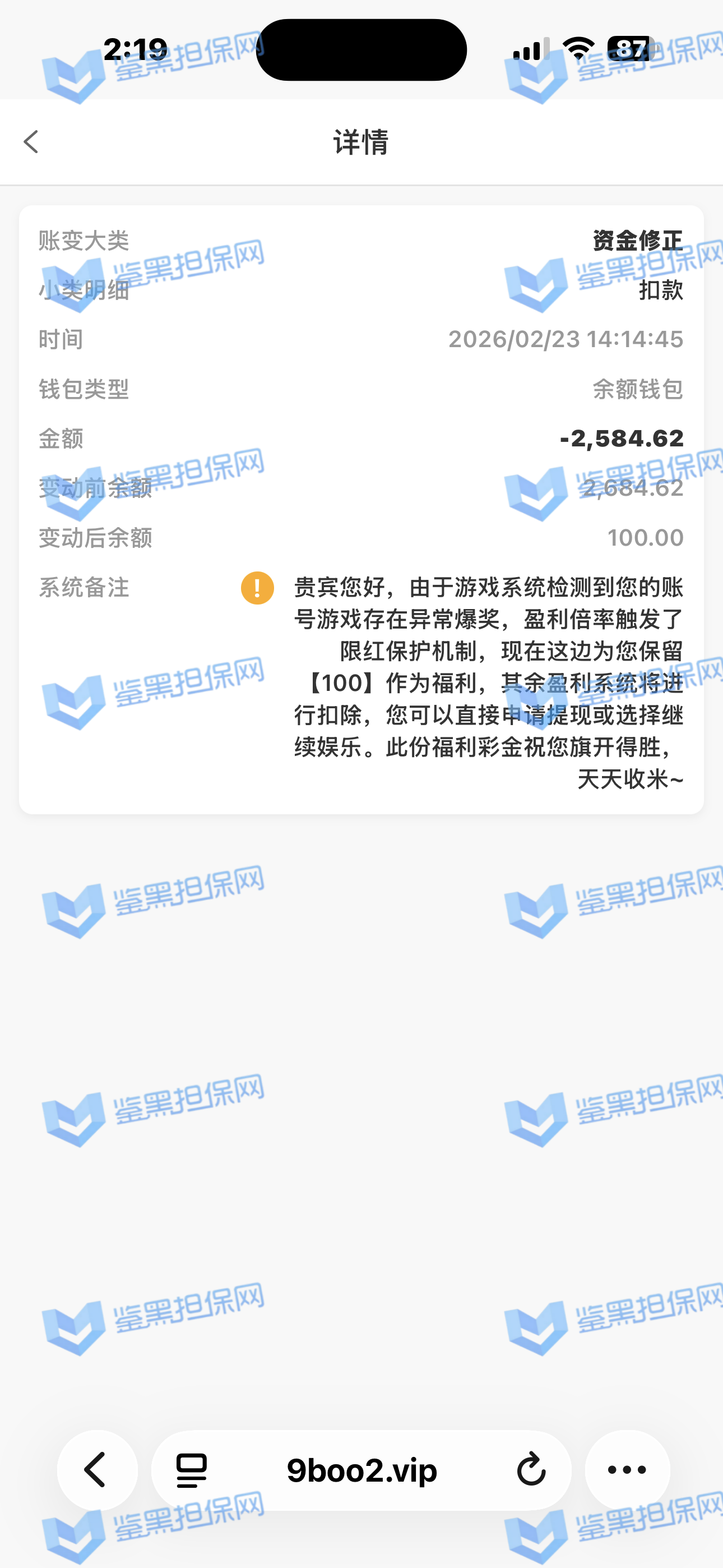 2,鉴黑担保网维权专员联系核实情况,对方表示存在异常爆奖,盈利倍率触发了限红保护机制,故扣除异常盈利金额,保留100福利彩金可直接提现,且告知该玩家已经提现成功。