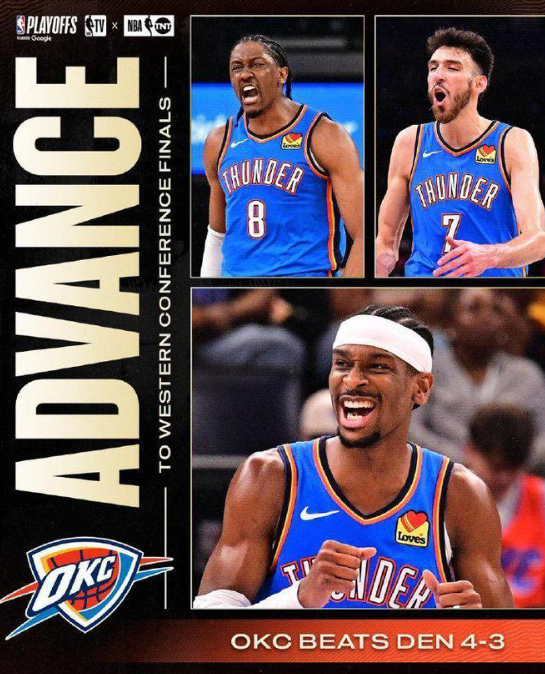 雷霆:首轮4-0横扫灰熊,次轮4-3淘汰掘金;